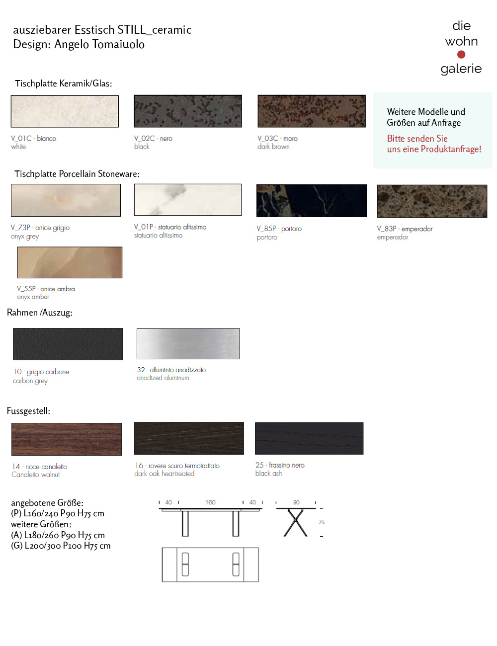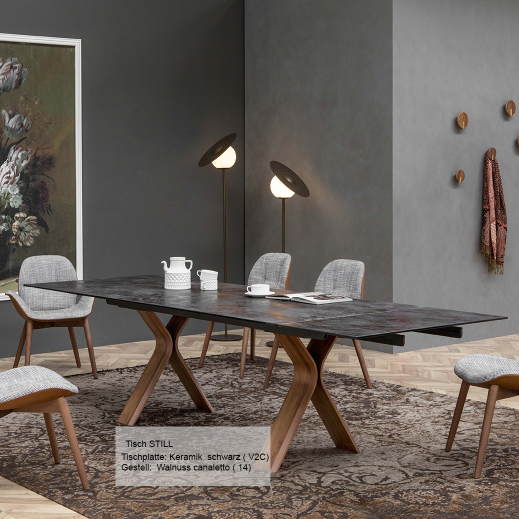 Unser neuer Trendsetter STILL ist zeitlos und vielseitig einsetzbar. Daher wird er auch in einer Vielzahl von Varianten angeboten. Hier als rechteckiger ausziehbarer Keramiktisch mit abgerundeten Ecken.Er wird  in aktuellen Keramikvariationen angboten und auch in Pozellankeramik mit Marmoreffekt. Zusammen mit einem gebogenen Gestell aus Holz wird dieser Tisch im Nu zum Mittelpunkt Ihres Esszimmers. Unser italienischer Designtisch STILL hat eine klare Formensprache und eine Vielzahl an Individualisierungsmöglichkeiten. Wir beraten Sie gerne ausführlich.Setzen Sie mit dem Esstisch STILL gezielt Akzente in Ihrem Wohnambiente! Tischplatte aus Laminam ® Keramik  oder Porzelan Steinzeug mit Marmoreffekt  weitere Informationen zu den unterschiedlichen Keramiken finden Sie unten Auszugstechnik Alu matt  leichtgängig und beidseitig Fußgestell Vollholzgestell lasiert in Raucheiche; Canaletto Walnuss oder Esche schwarz Angebotene Größen L: 150/230cm B: 100cm H: 75 cm weitere Größen auf Anfrage L: 180/260cm B: 100cm H: 75cm L: 215/295cm B: 100cm H: 75cm  Weitere Informationen Der Tisch wird in mehreren Paketen geliefert.