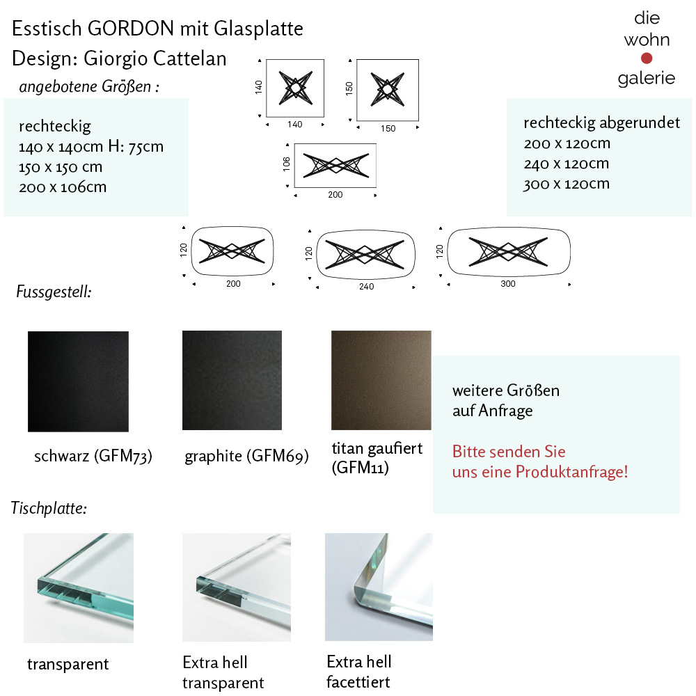Viele Stahlstreben, dezent gaufiert bilden die Basis für der eine runde, quadratische, rechteckige oder abgerundete Glastischplatte. die den Blick auf ein interessantes Muster freigibt.Bei kleiner Tischplatte erinnert dieses an einen Stern. Je größer die Tischplatte des Design-Glasesstisches GORDON ist, desto weiter zieht sich auch die Unterkonstuktion auseinander und gibt ein fantastisch filigranes Bild ab. Wir bieten 2 quadratische, eine rechteckige und drei rechteckig abgerundete Varianten dieses Tisches an.