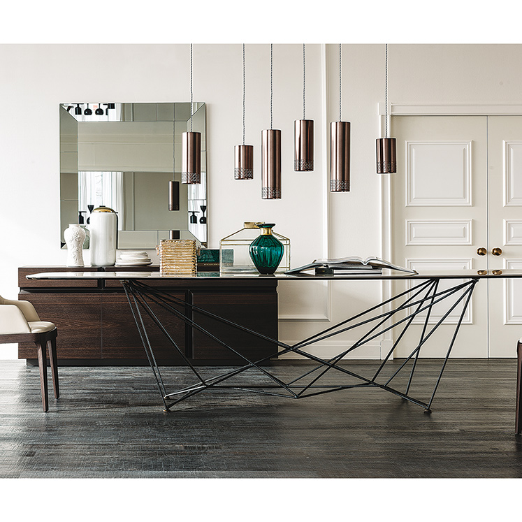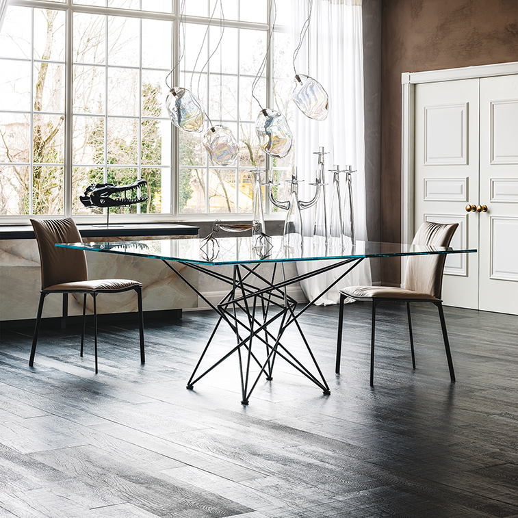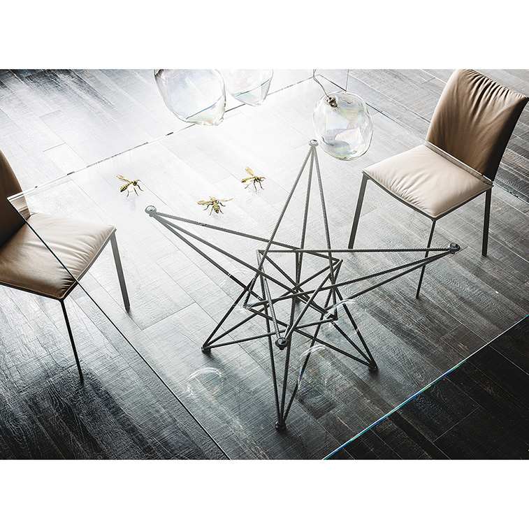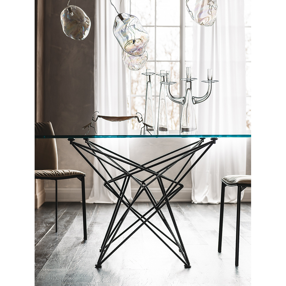 Der Glasesstisch GORDON ist durch seinen Fuß aus Baustahlstreben ein absoluter Hingucker.